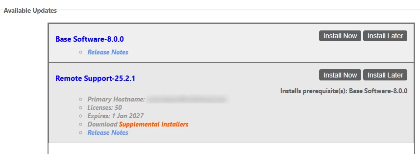 - Are the upgrades tied to each other? Example: Can we upgrade base without upgrade remote support 25.2.1