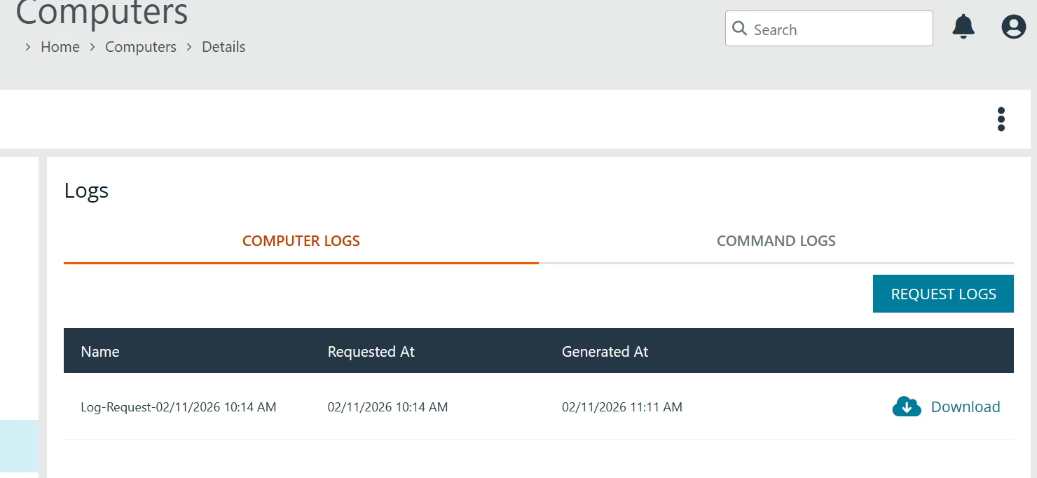 The Logs page displays.- Select the type of log you want to download (Computer or Command).